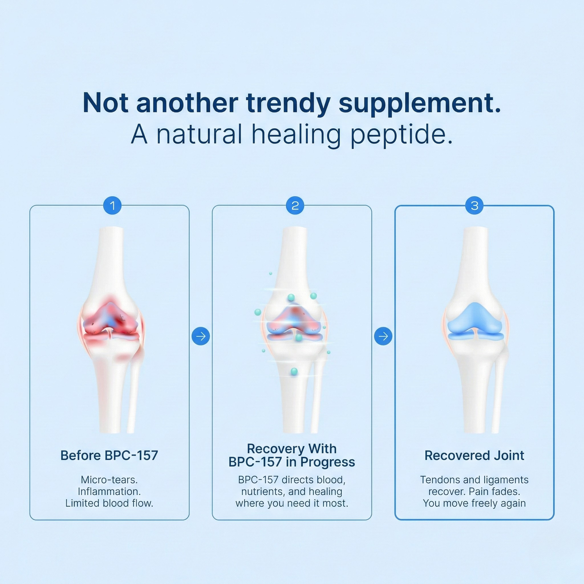Tendons receive far less blood flow than muscle. Without blood flow, repair cells can’t reach the damage – so healing stalls, even after physio and rest.BPC-157 supports new blood vessel growth to restart the repair process.