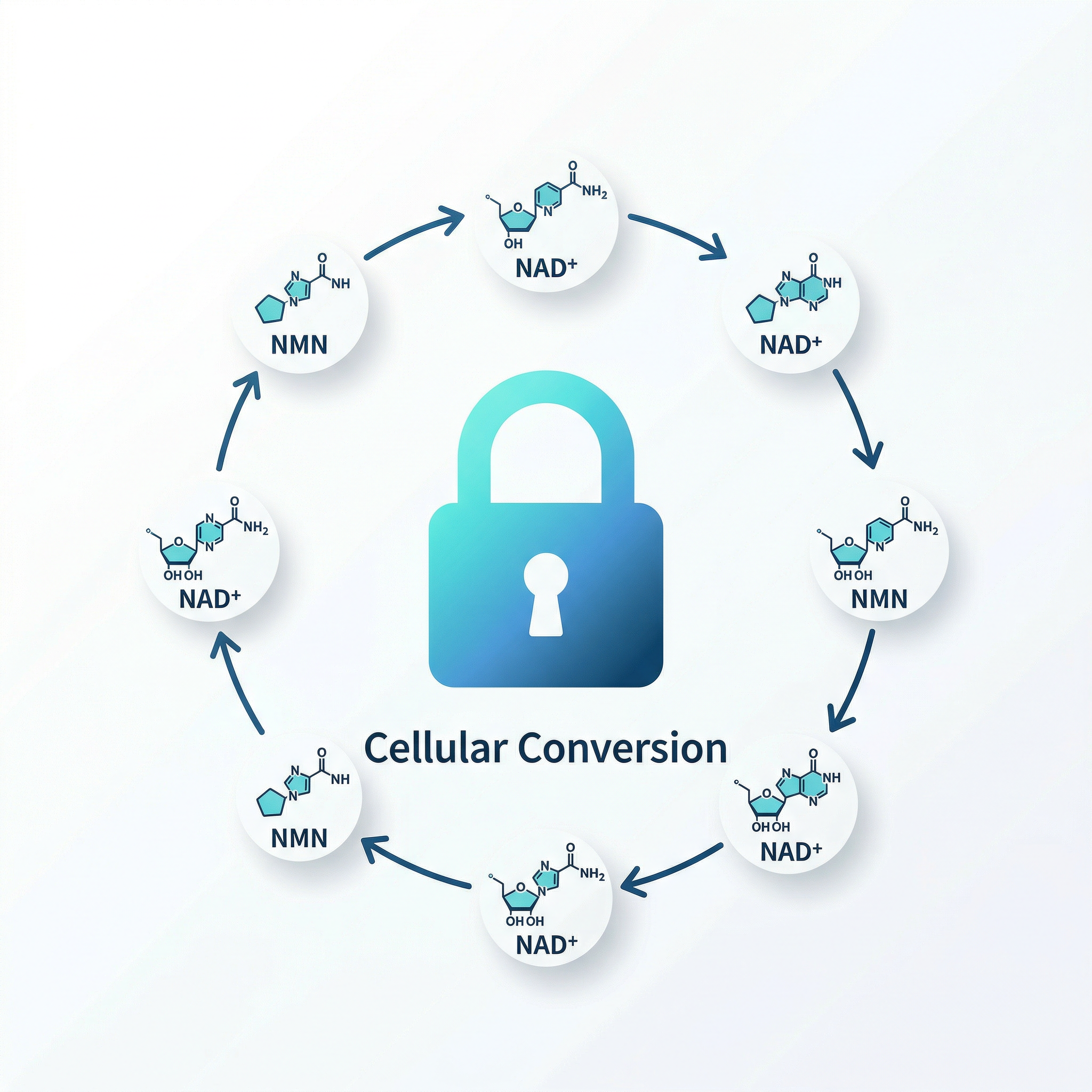 • NMN begins converting into NAD+ inside your cells